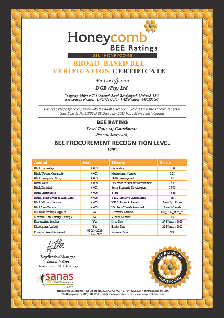DGB has a tightly controlled Quality Assurance system to ensure that the standards of our business practices, extending to our suppliers in the production and manufacture chain of our products, is approachable and fulfills all legal obligations and minimum international standards of best practice.